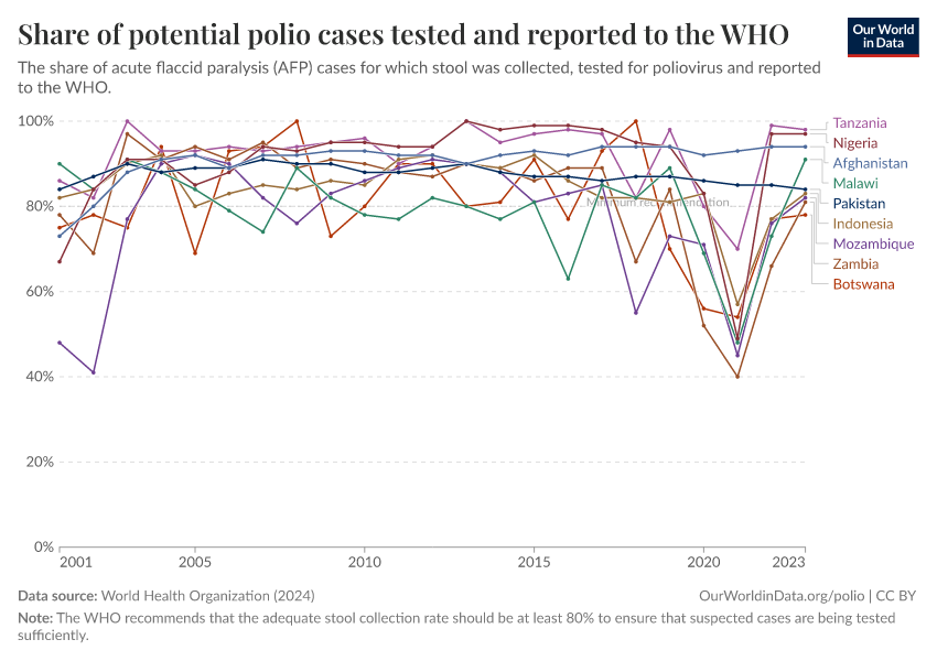 Saloni Dattani and Fiona Spooner (2022) - “We need more testing to eradicate polio worldwide” Published online at OurWorldinData.org. Retrieved from: 'https://who-mortality-db.owid.pages.dev:8789/20260304-094028/polio-testing.html' [Online Resource] (archived on March 4, 2026).BibTeX citation