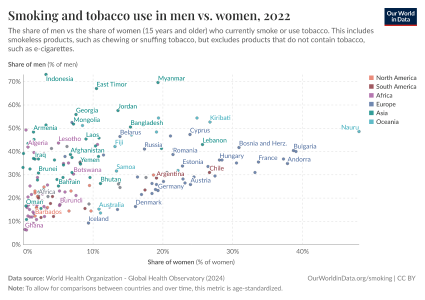 In almost all countries, it is true that a large share of men smoke. In the visualization, we see the share of men who smoke (plotted on the vertical axis) compared with the same metric for women (plotted on the horizontal axis).
