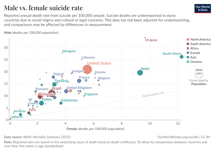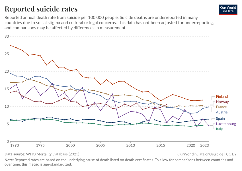 Saloni Dattani, Lucas Rodés-Guirao, Hannah Ritchie, Max Roser, and Esteban Ortiz-Ospina (2023) - “Suicides” Published online at OurWorldinData.org. Retrieved from: 'https://who-mortality-db.owid.pages.dev/suicide' [Online Resource]BibTeX citation