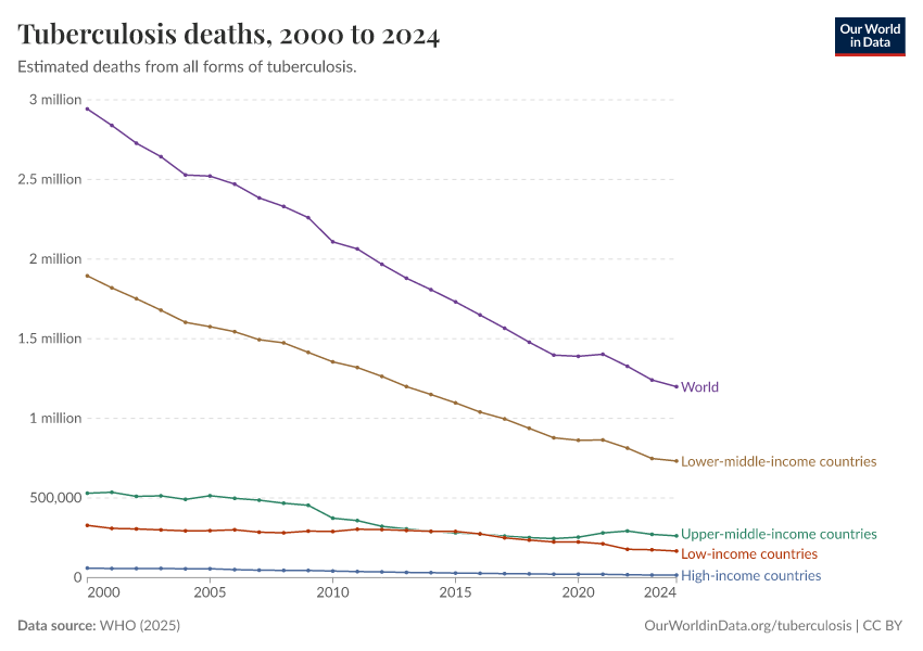 Hannah Ritchie and Fiona Spooner (2025) - “The end of tuberculosis that wasn’t” Published online at OurWorldinData.org. Retrieved from: 'https://who-mortality-db.owid.pages.dev:8789/20260304-094028/the-end-of-tuberculosis-that-wasnt.html' [Online Resource] (archived on March 4, 2026).BibTeX citation